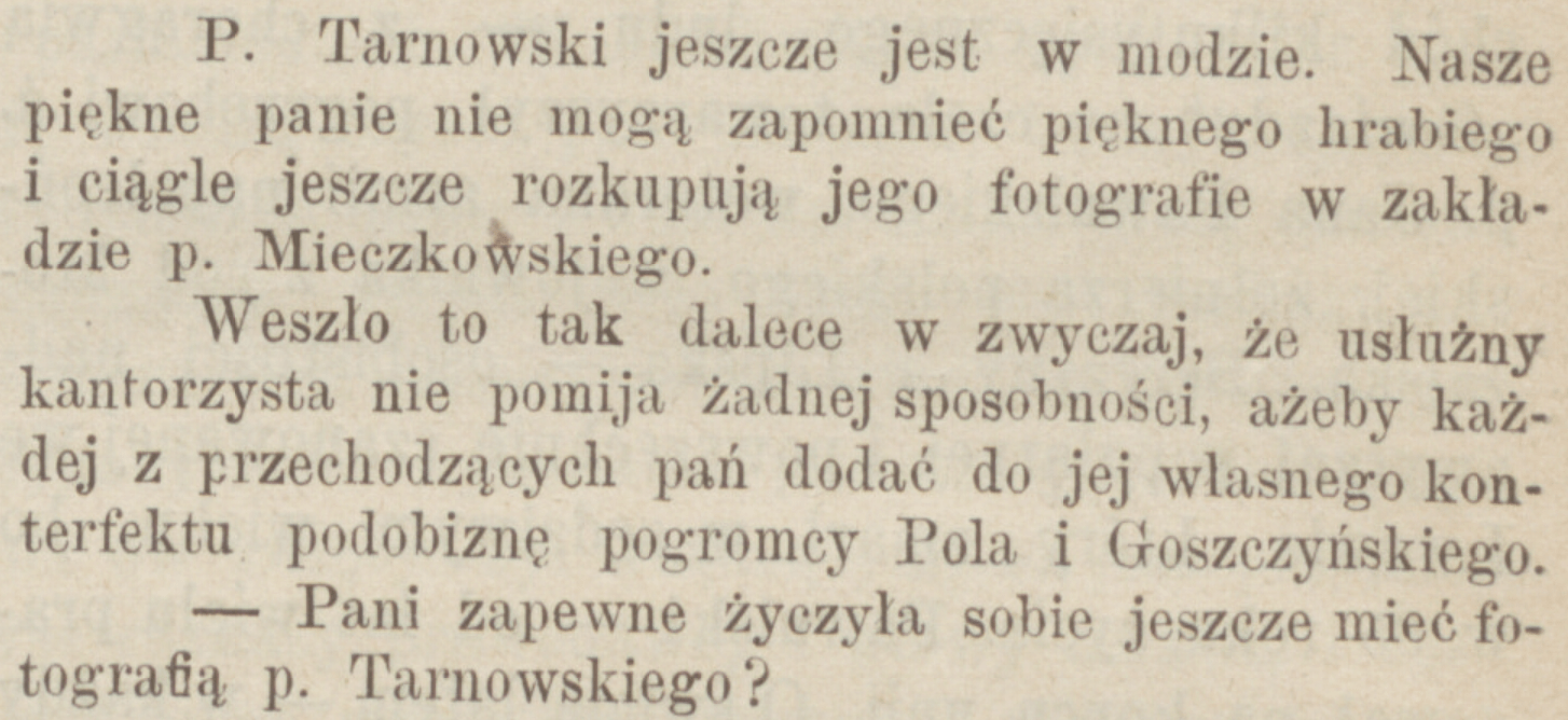 P . Tarnowski jeszcze jest w modzie. Nasze piękne panie nie mogą zapomnieć pięknego hrabiego i ciągle jeszcze rozkupują jego fotografie w zakładzie p. Mieczkowskiego. Weszło to tak dalece w zwyczaj, że usłużny kantorzysta nie pomija żadnej sposobności, ażeby każdej z przechodzących pań dodać do jej własnego konterfektu podobiznę pogromcy Pola i Goszczyńskiego.