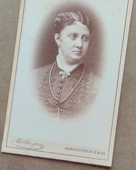 Dość kanciasta, jak na biżuterię z epoki brosza wydaje się zarówno zawieszona na ciasnych sznurach pereł, jak i zapięta na szczątkowym kołnierzyku sukni. Do tego ten długi sznur sprytnie przepleciony za guzikiem, bogaty cording, misterne fale układane na żelazkach… Diabeł tkwi w szczegółach! (więcej…)