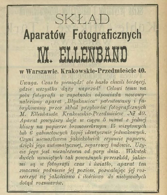 Uwaga. Czas to pieniądz! oto hasło chwili bieżącej, gdzie wszystko dąży naprzód! Celowi temu na polu fotografii w zupełności odpowiada nowowynaleziony aparat „Błyskawica” patentowany i fabrykowany przez skład przyborów fotograficznych M. Ellenbanda Krakowskie Przedmieście Nr 40. Aparat powyższy daje w ciągu 5 minut z jednej kliszy na papierze bromosrebrnym 15 wizytowych lub 6 gabinetowych kopij identycznie jednakowych. Czyni niemożliwem jakiekolwiek zepsucie papieru, dzięki jego automatycznej, zegarowej budowie. Użycie jego jest niezależnem od pory dnia. Wskutek dwóch usuniętych tak poważnych przeszkód, jakiemi są w fotografii czas i światło, aparat ten znacznie podniesie jej poziom, pozwalając jej rozszerzyć się jakościowo i ilościowo do niebywałych dotąd rozmiarów.